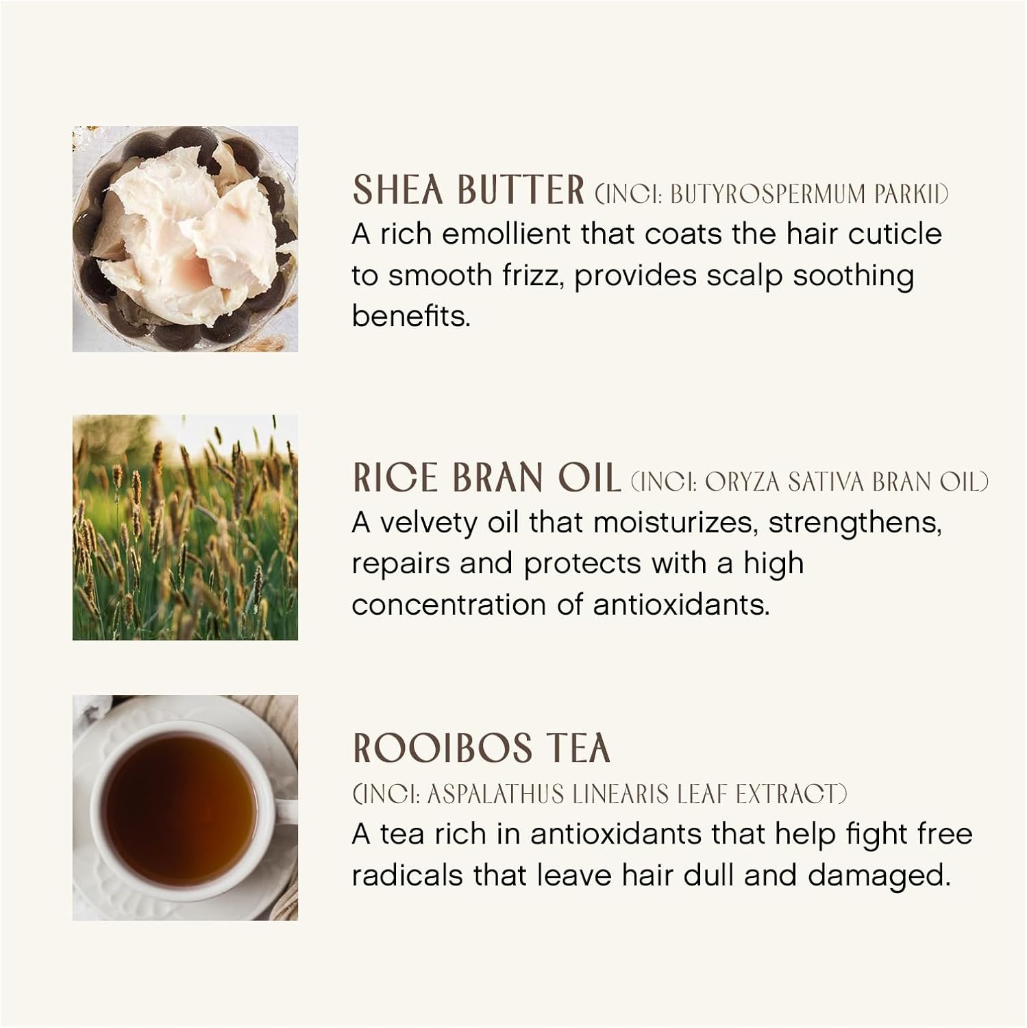 - BENEFITS: Crafted With A Rich Blend Of Organic Shea Butter, Rice Bran Oil + Rooibos Tea For Moisture + Strength.