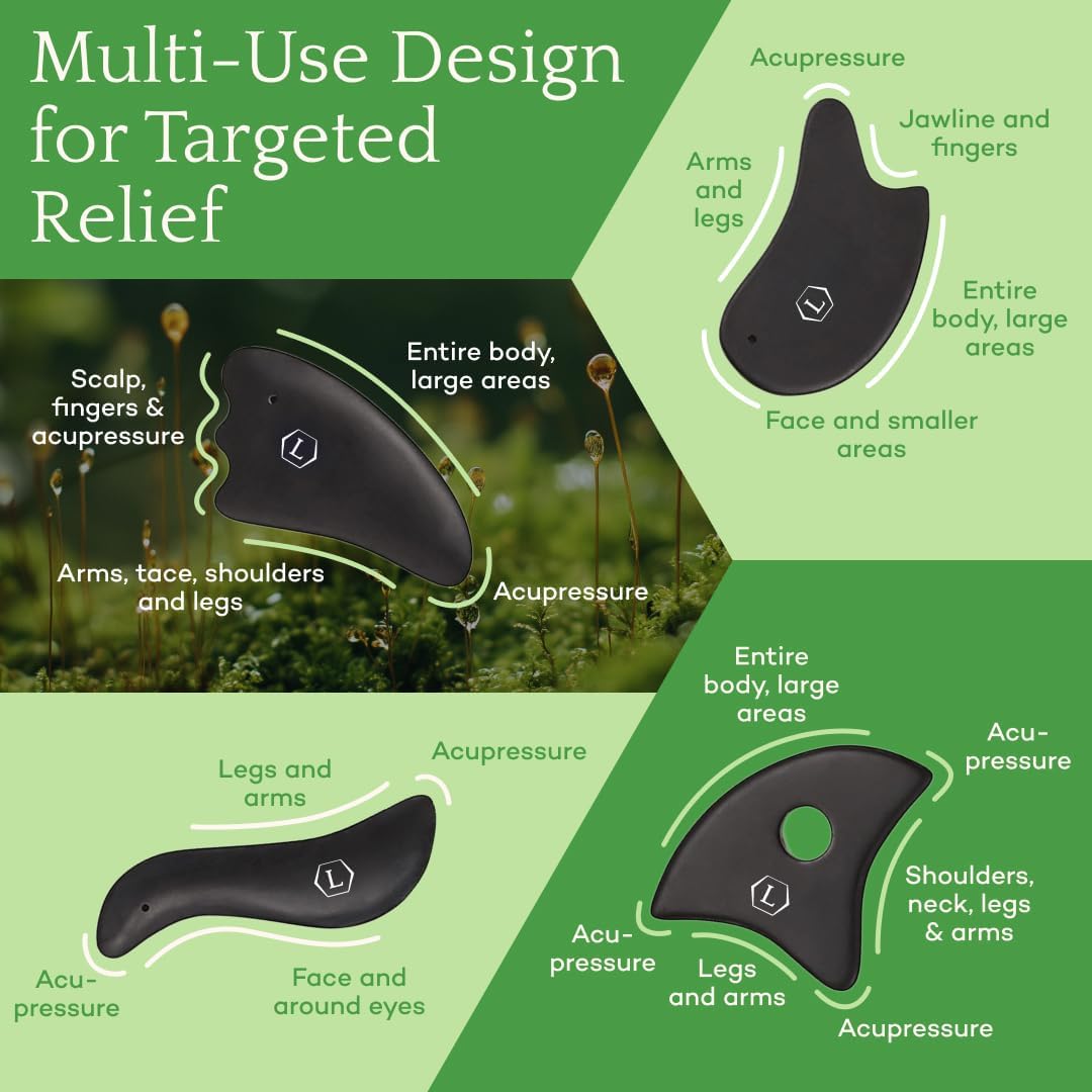 LUONKOS Gua Sha Tools Set - Large Black Bian Stone, 4-Pc - Face & Lymphatic Drainage Massager - Skin Care & Face Sculpting Tool