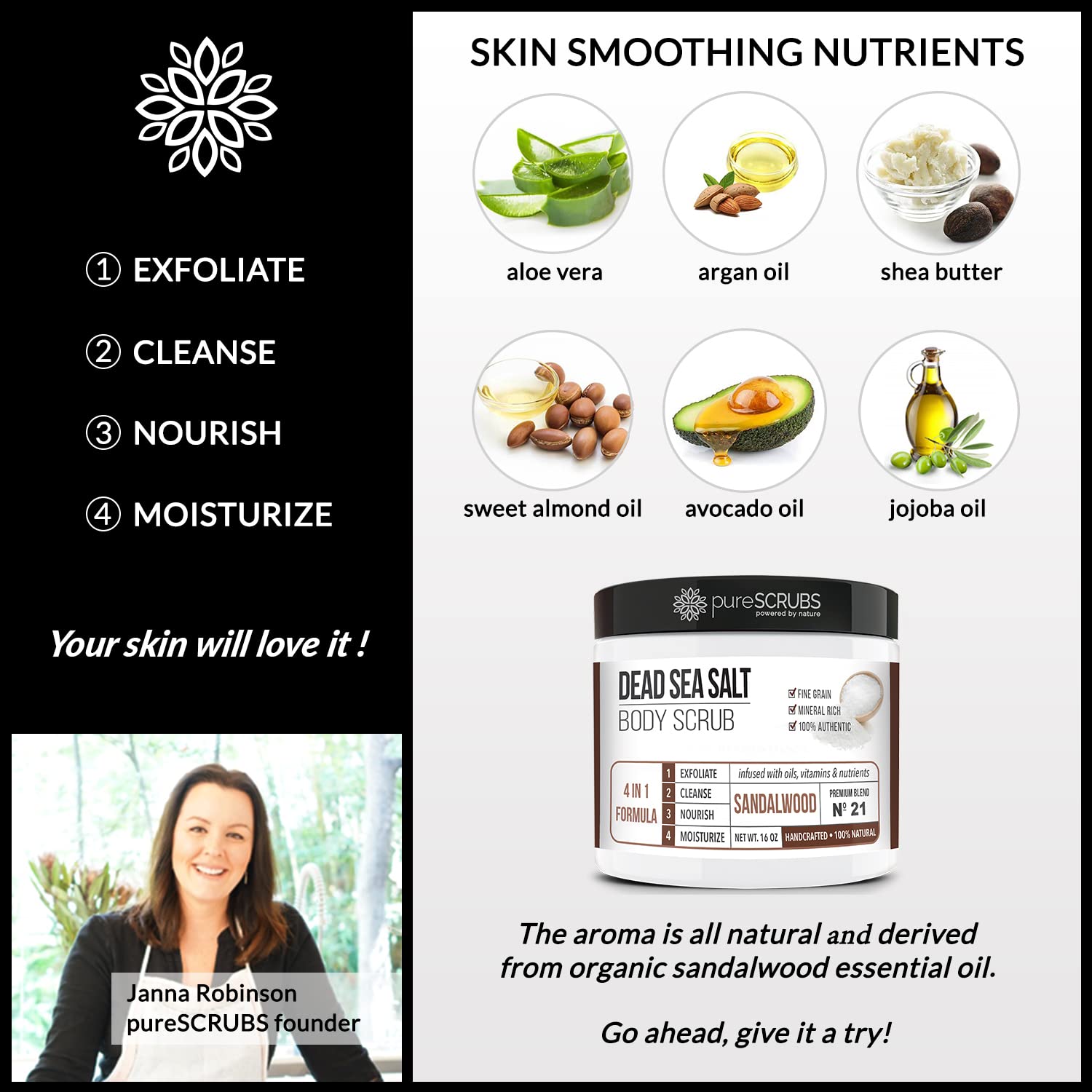 • GET ULTRA SMOOTH SKIN FAST - THIS WORKS! Our unique “4 in 1 Formula” does everything a body scrub should do and more - EXFOLIATE, CLEANSE, NOURISH & MOISTURIZE. Fine grain dead sea salt infused with essential oils, nutrients and skin softeners helps to smooth away rough, bumpy, and uneven textures to instantly reveal your true soft, healthy and radiant skin. You'll love the sandalwood aroma!