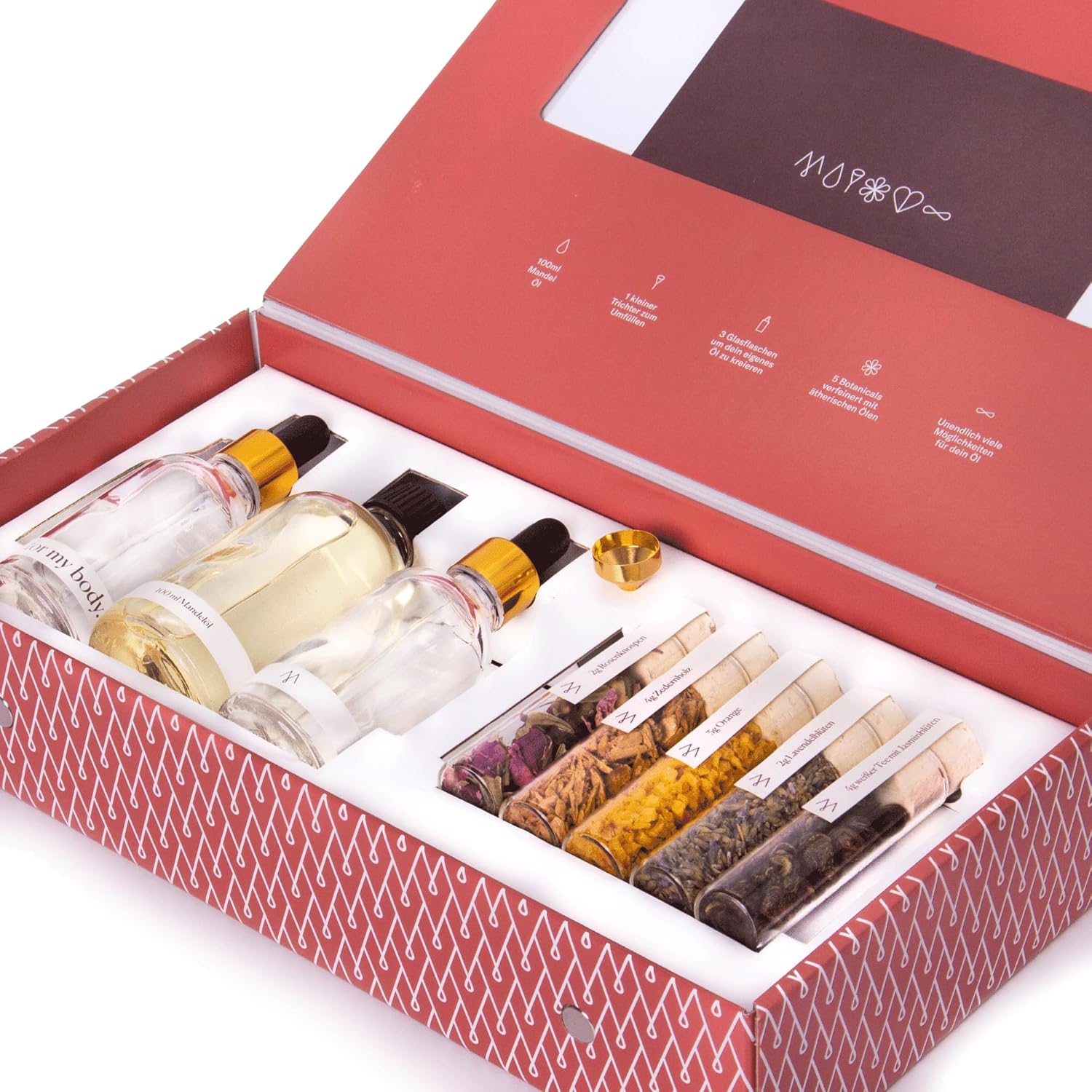 - TREAT YOURSELF: The MUY beauty set is an elegant, easy-to-use DIY kit to make your own bath, hair, and body oils. Our self-care set is perfect for at-home spa days and comes with pure almond oil, rose petals, cedar wood, orange peel, lavender flowers, and jasmine.