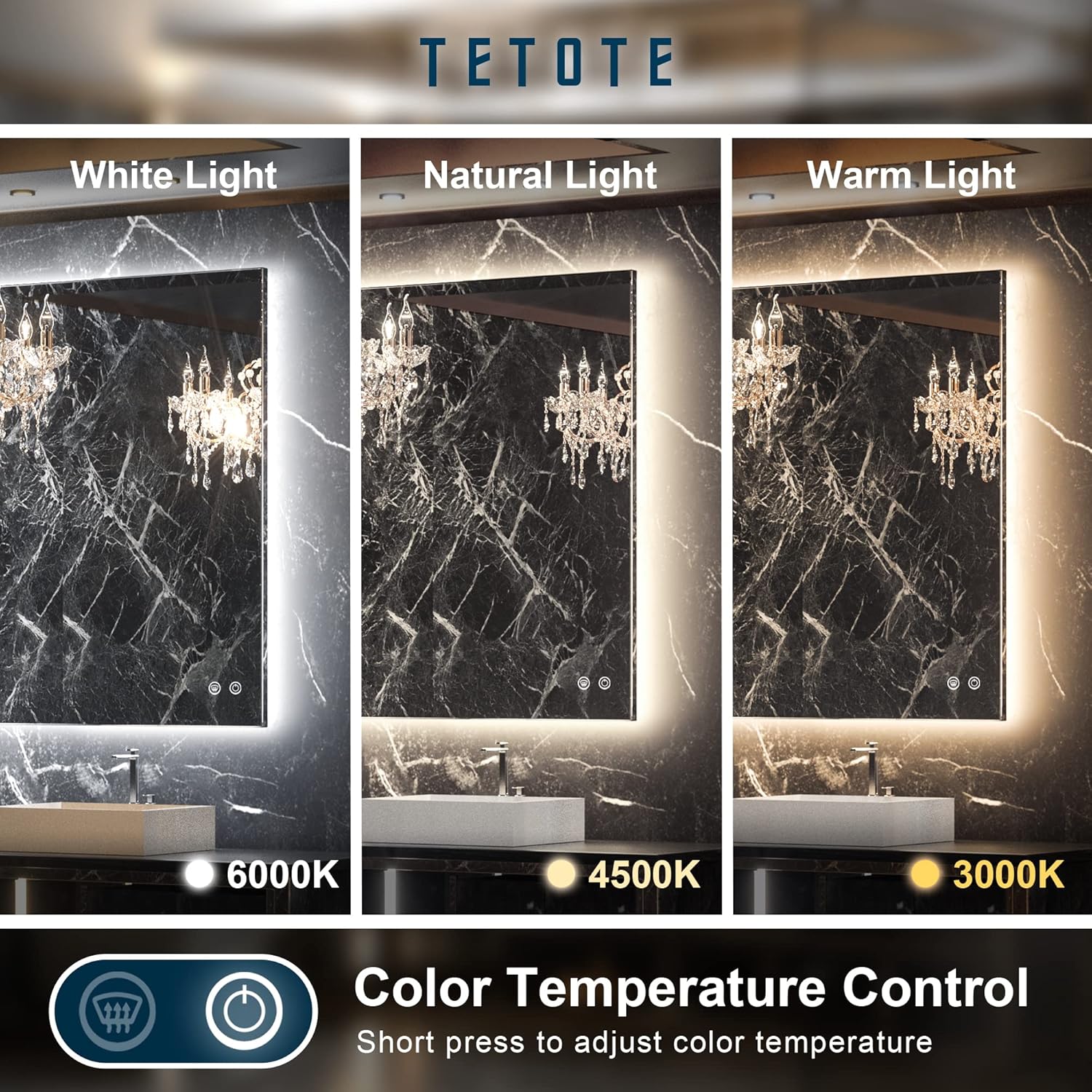 TETOTE 60 x 40 LED Backlit Bathroom Mirror with Light,3 Color White/Warm/Natural,Anti-Fog Lighted Mirror,Dimmable,Vanity Mirror,Wall Mounted