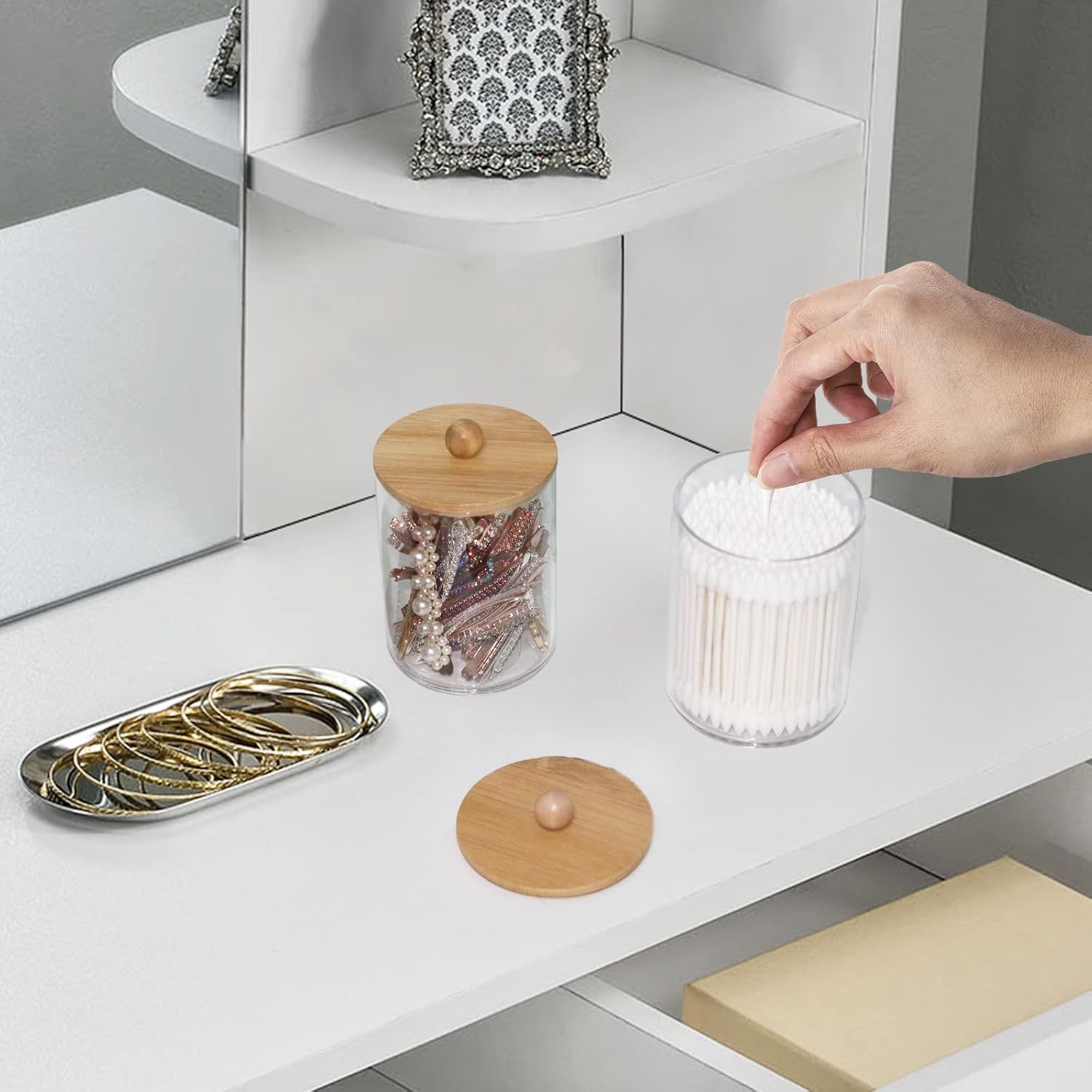 - Each cotton ball dispenser has a natural bamboo lid which is healthy, environmentally friendly and keeps from dust