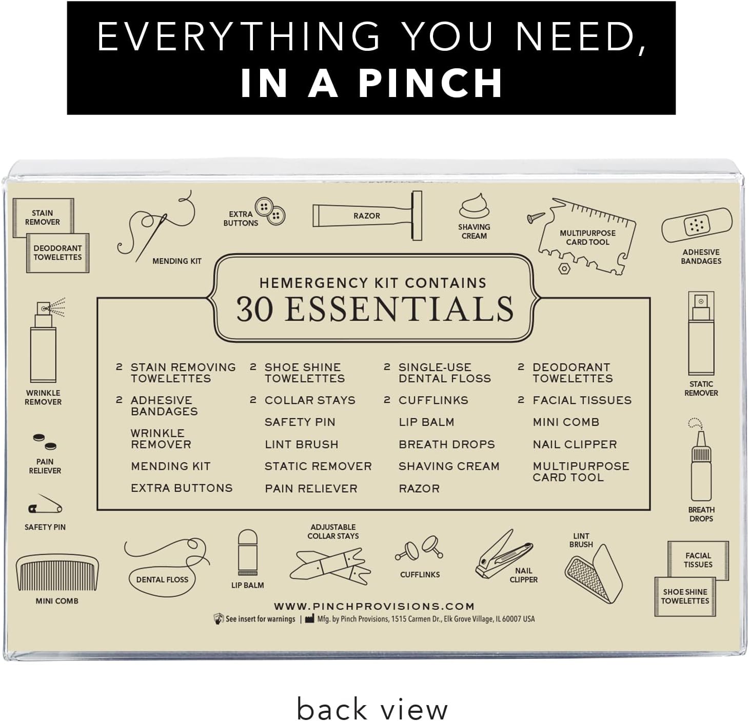 • PERSONAL GROOMING & EMERGENCY KIT FOR MEN - Men have emergencies too, and to tackle those, Pinch Provisions' Hemergency Kit is the perfect choice. It includes necessary, practical items that save the day so that you look and feel your best!