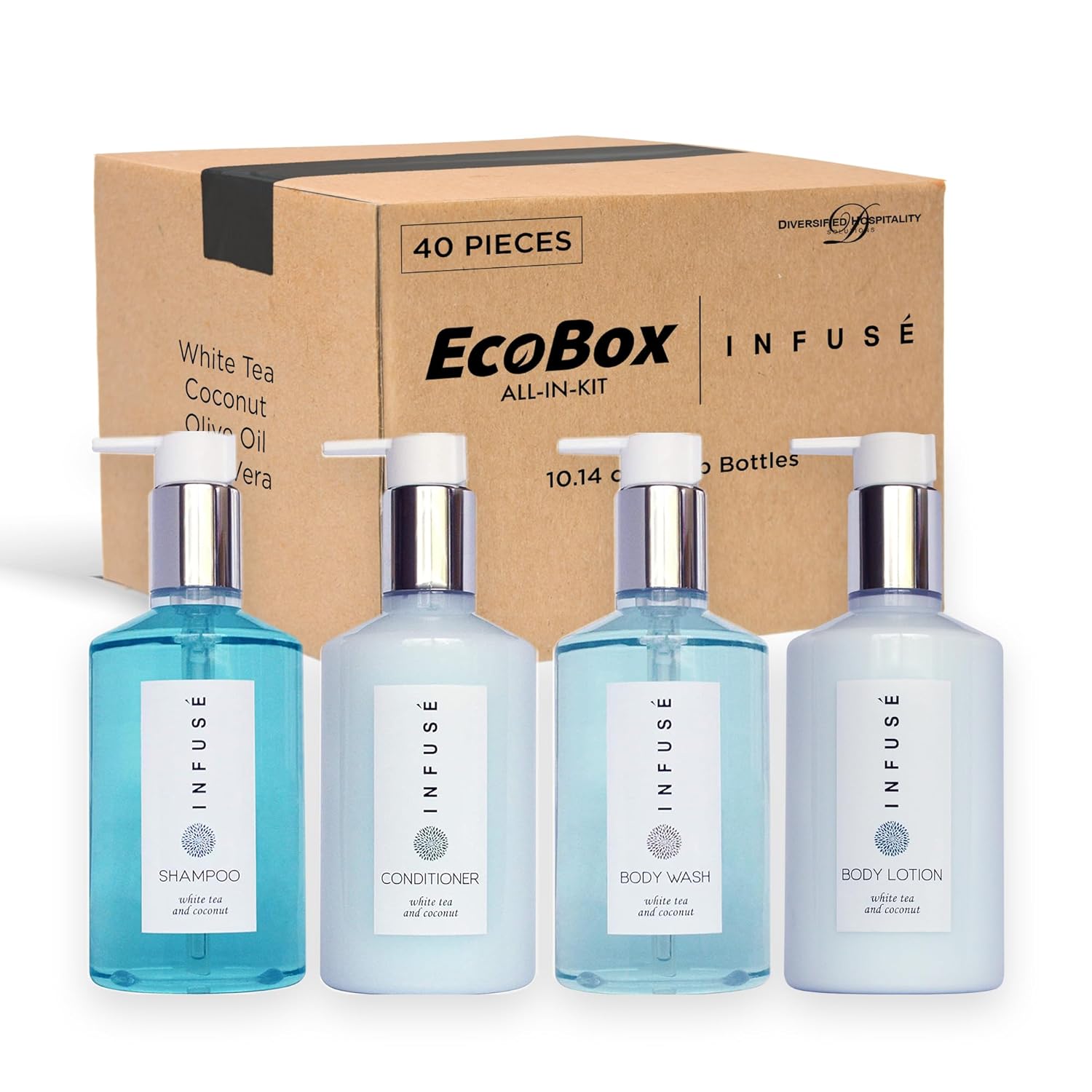 1-Shoppe Infuse 40 Piece Ecobox All-In-Kit | White Tea and Coconut Soap | 12 Shampoo, 8 Conditioner, 12 Body Wash & 8 Lotion | 10oz Hotel Soaps and Toiletries Bulk | Personal Care Products