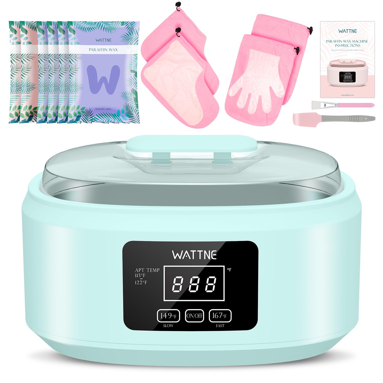 - Package Includes: 1 paraffin wax machine, 6 packs of 200g refill material (3 lavenders and 3 peach each) , 1 pair thermal mitts , 1pair thermal booties, 100 pairs PE mitts , 100 pairs PE booties, 1 beauty brush, 1 silicone spoon,1 heat insulating grid