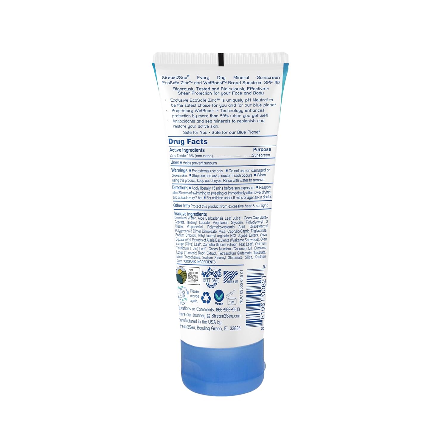 SPF 45 Every Day Active Mineral Sunscreen | 2.5 Fl Oz Biodegradable & Reef Safe Sunscreen for Face & Body | Non-Greasy, Lightweight & Sheer Mineral Protection Against UVA & UVB by Stream2Sea
