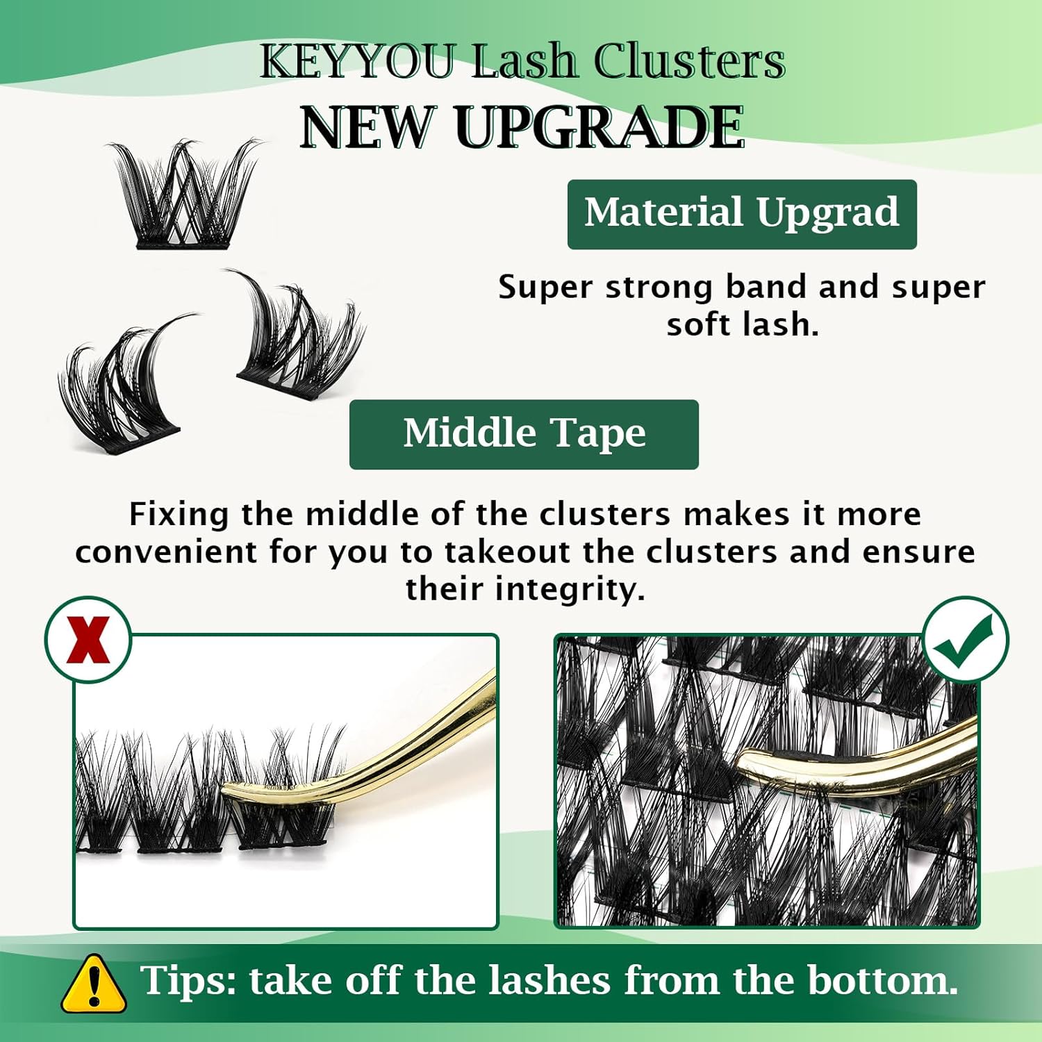 - 【Soft&Comfortable】KEYYOU lash cluster are made of imported materials,the stem line is thinner and softer, the eyelash cluster are lighter and more comfortable to wear.96 clusters in one tray ,more cost-effective.
