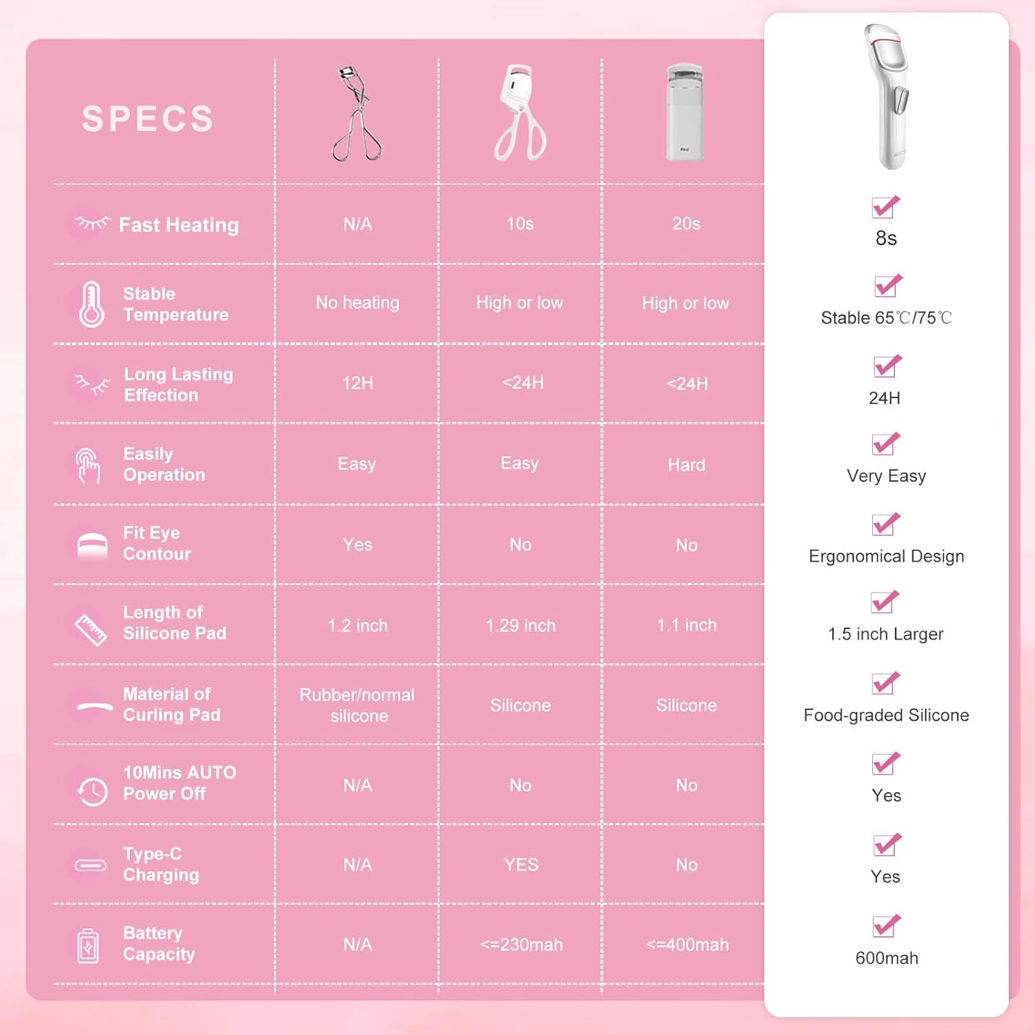 - ADVANCED SMART TEMPUTURE CONTROL SYSTEM: Heating Eyelashes Curler make the accuracy of temperature is improved 60%, achieved the curling temputure fluctuating only at +/-3 ° after fully warm up, not +/-10 ° like others heating eye lash curlers. more stabilized curling temputure offer quantity of heat to get better curling result and long lasting.