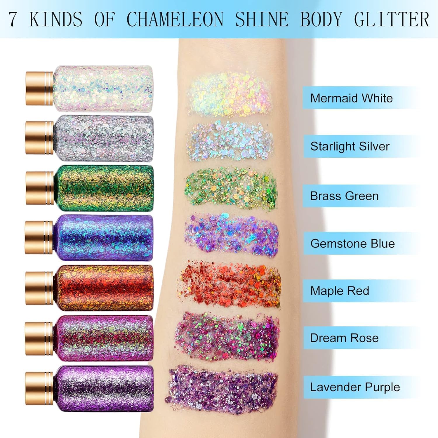 - EASY TO APPLY, SAVE TIME : This glitter gel comes with a mini makeup brush that helps you precisely define glitter placement, transforming messy makeup into a more refined and natural look. You can also use your fingers to apply it over large areas on your face, hair, or body. Mix and match multiple colors to create a one-of-a-kind mermaid makeup look.
