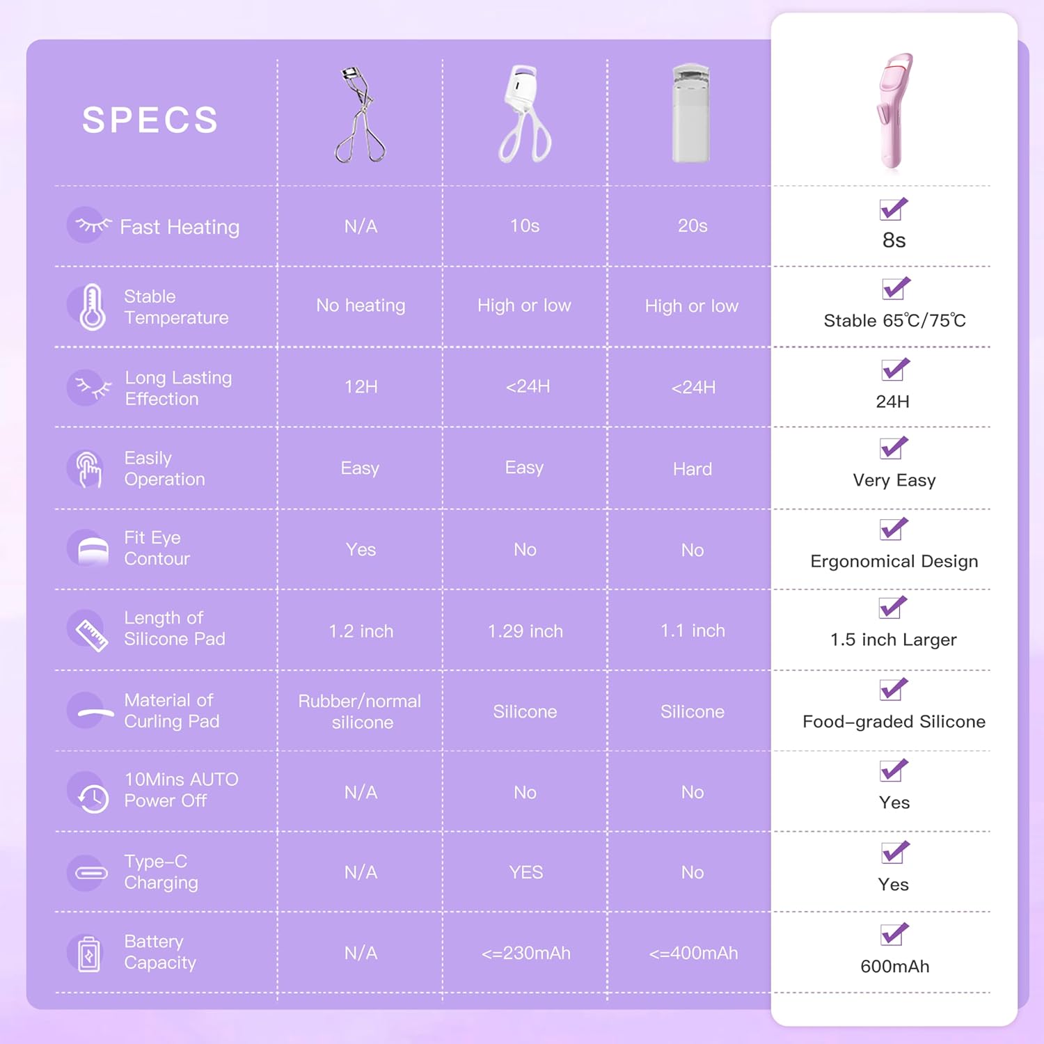 Heated Eyelash Curler Professional - Eye Lashes Curler with Innovative Heating Silicone, Electric Eyelashes Curler with 600mAh Rechargeable Battery EC4001 (Voilet)