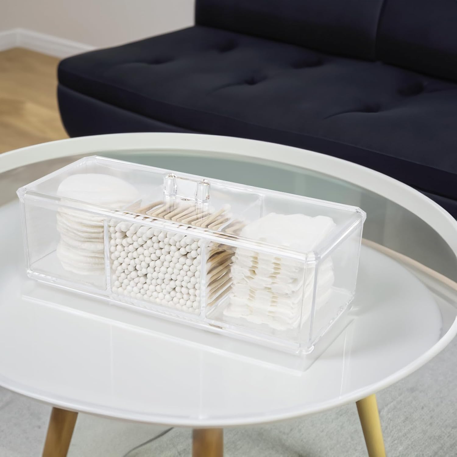 Clear Bathroom Dresser Organizer - Cotton Ball Swab Holder with 3 Divided Compartments&Lid, , Waterproof Transparent Small Plastic Storage Containers, Vanity Makeup Organization