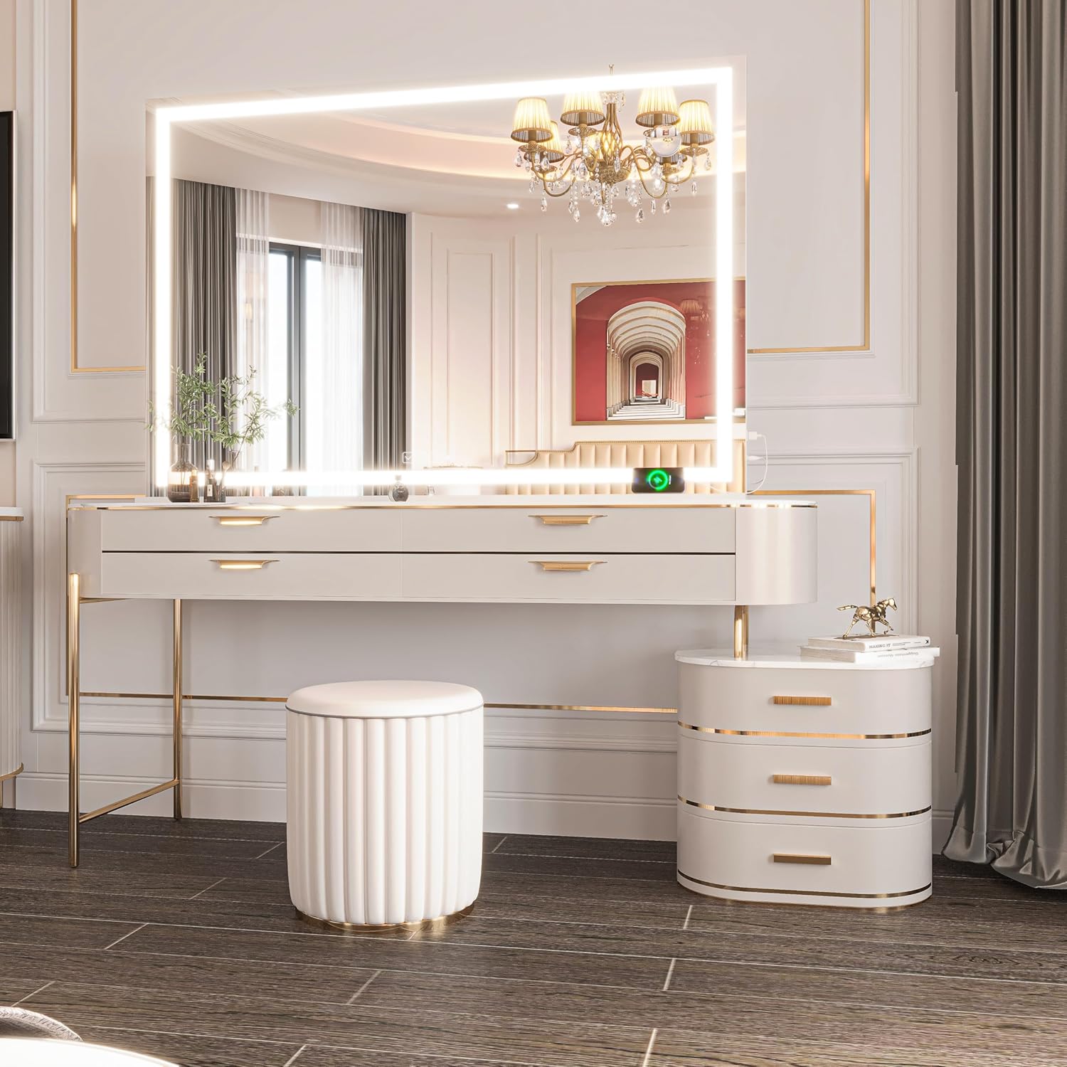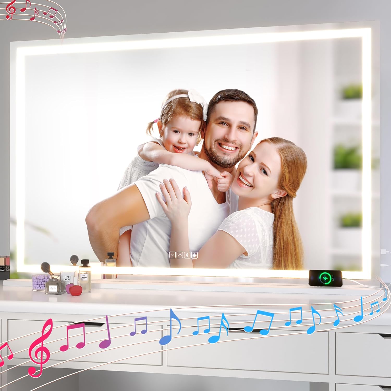 Hasipu Vanity Mirror with Lights and Bluetooth Speaker, 55" x 35.8" LED Makeup Mirror, Lighted Makeup Mirror with Dimmable 3 Modes, Touch Screen Control Vanity Mirror Square White