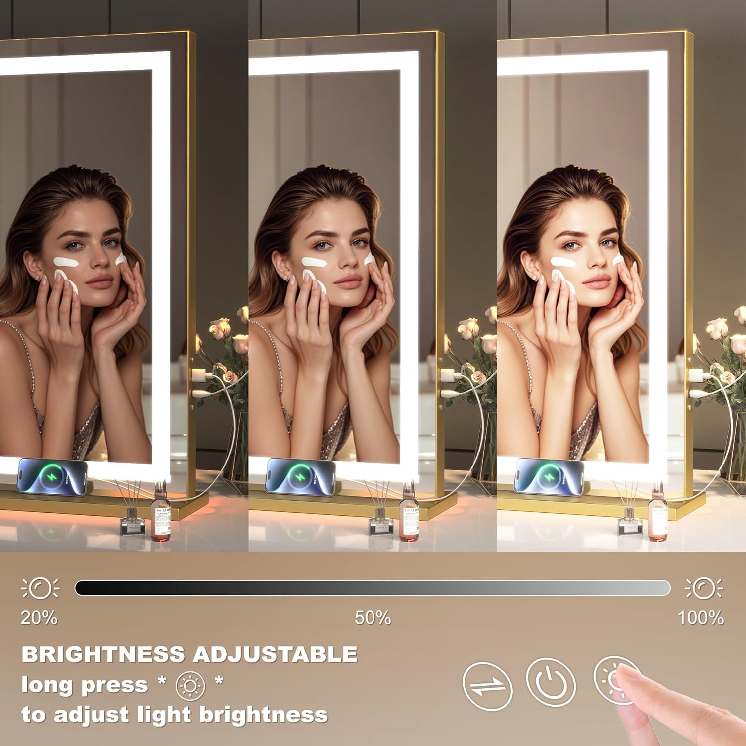 Hasipu Vanity Mirror with Lights, 23" x 18" LED Makeup Mirror, Lighted Makeup Mirror with Dimmable 3 Modes, Touch Screen Control Vanity Mirror Square Gold