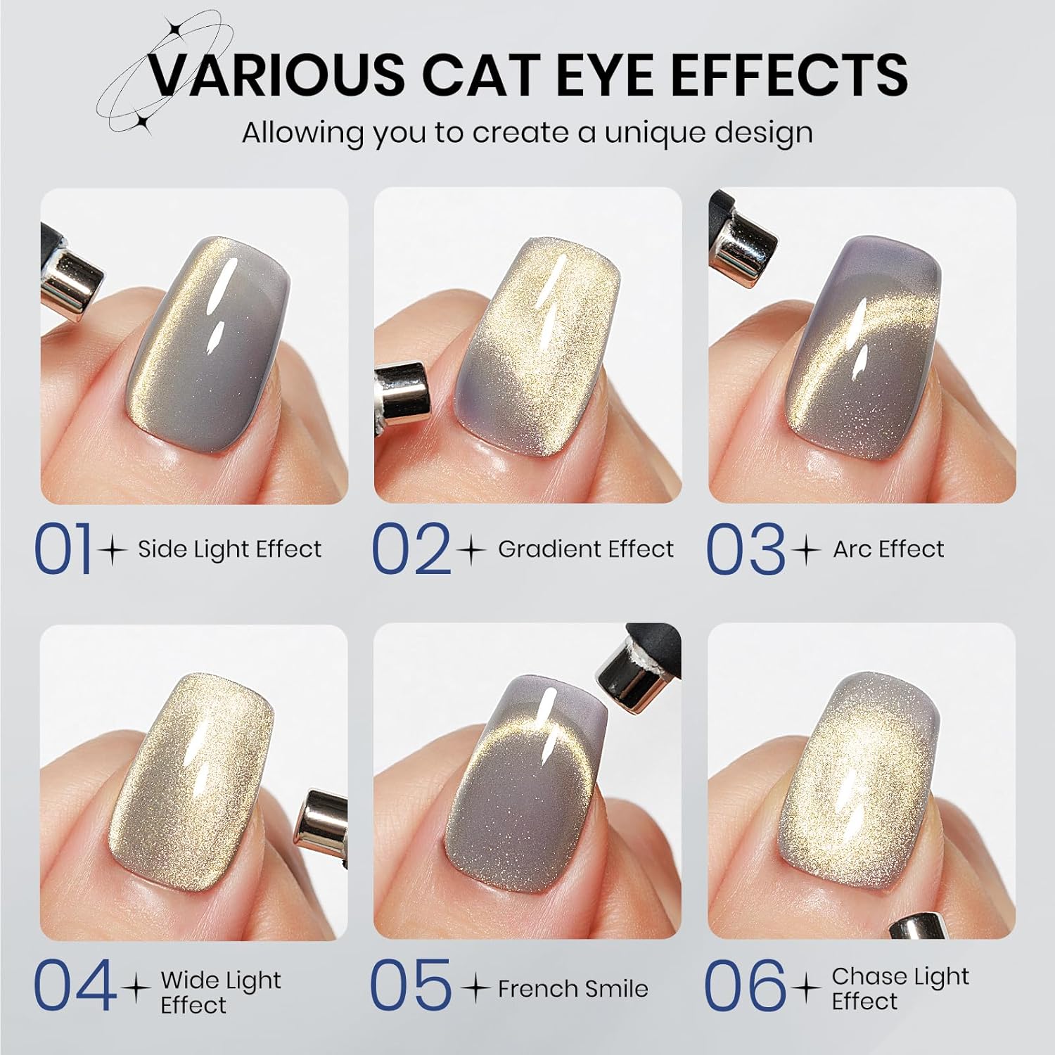 - Cat Eye Gel Nail Polish:1*15ml(0.5fl oz) gray blue cat eye gel nail polish with 1PC magnetic stick.This cat eye gel has a glittering gold magnetic powder that exudes glamorous shine and charm