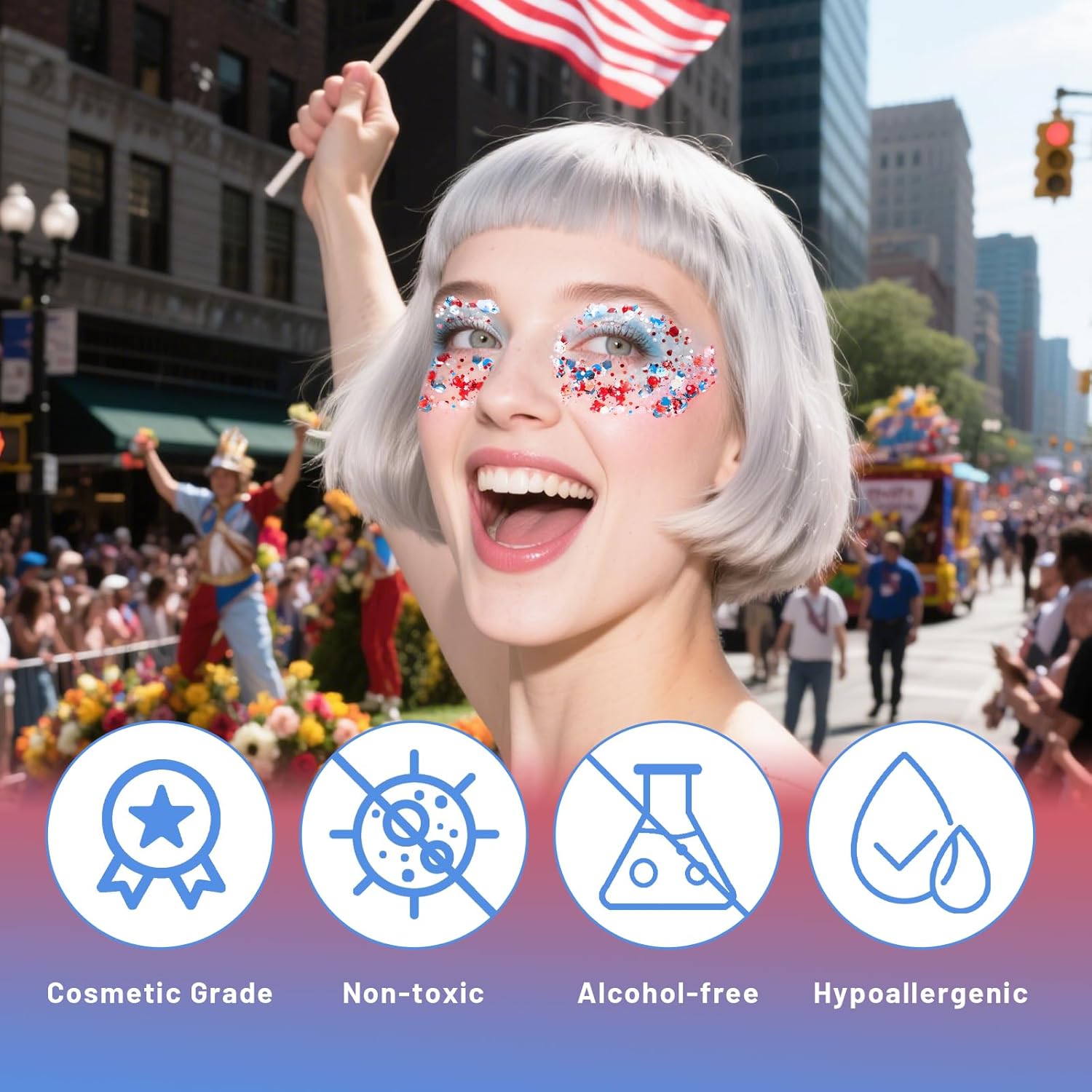 - Easy To Apply And Use:4th of July Face glitter consists of cosmetic-grade glitter that is gentle and non-irritating, and comes with its own gel that is easy to apply and saves makeup time. Apply the glitter gel to your hair and body with your fingertips or a brush, and your skin won't feel sticky after the gel dries.
