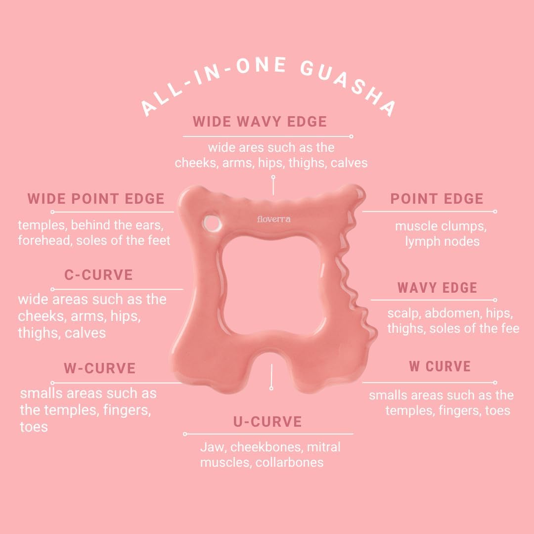 - 4 DISTINCT EDGES FOR FULL-BODY & FACIAL SCULPTING: Unlike typical gua shas with one flat edge, Floverra features four uniquely curved edges designed for specific areas—scalp, jawline, cheekbones, neck, shoulders, arms, and more. Built-in acupressure points help stimulate lymph nodes for true lymphatic drainage massage, giving you visible results from head to toe.